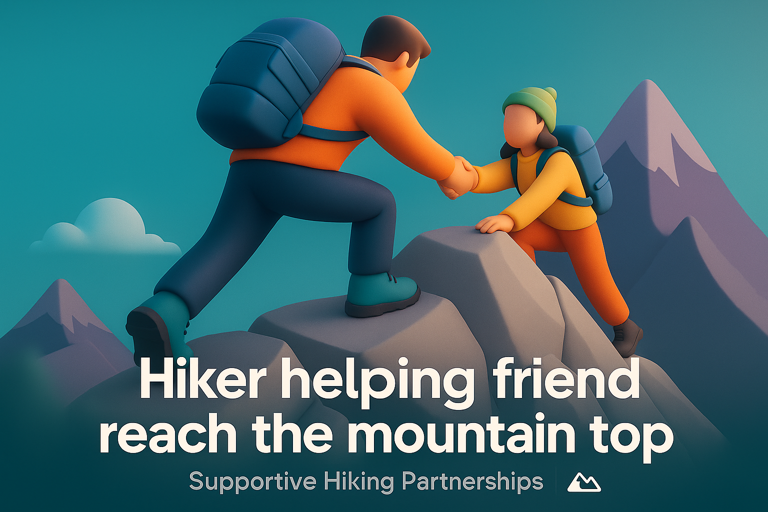 Hiker Assisting Friend to Summit Mountain, Dynamic Illustration