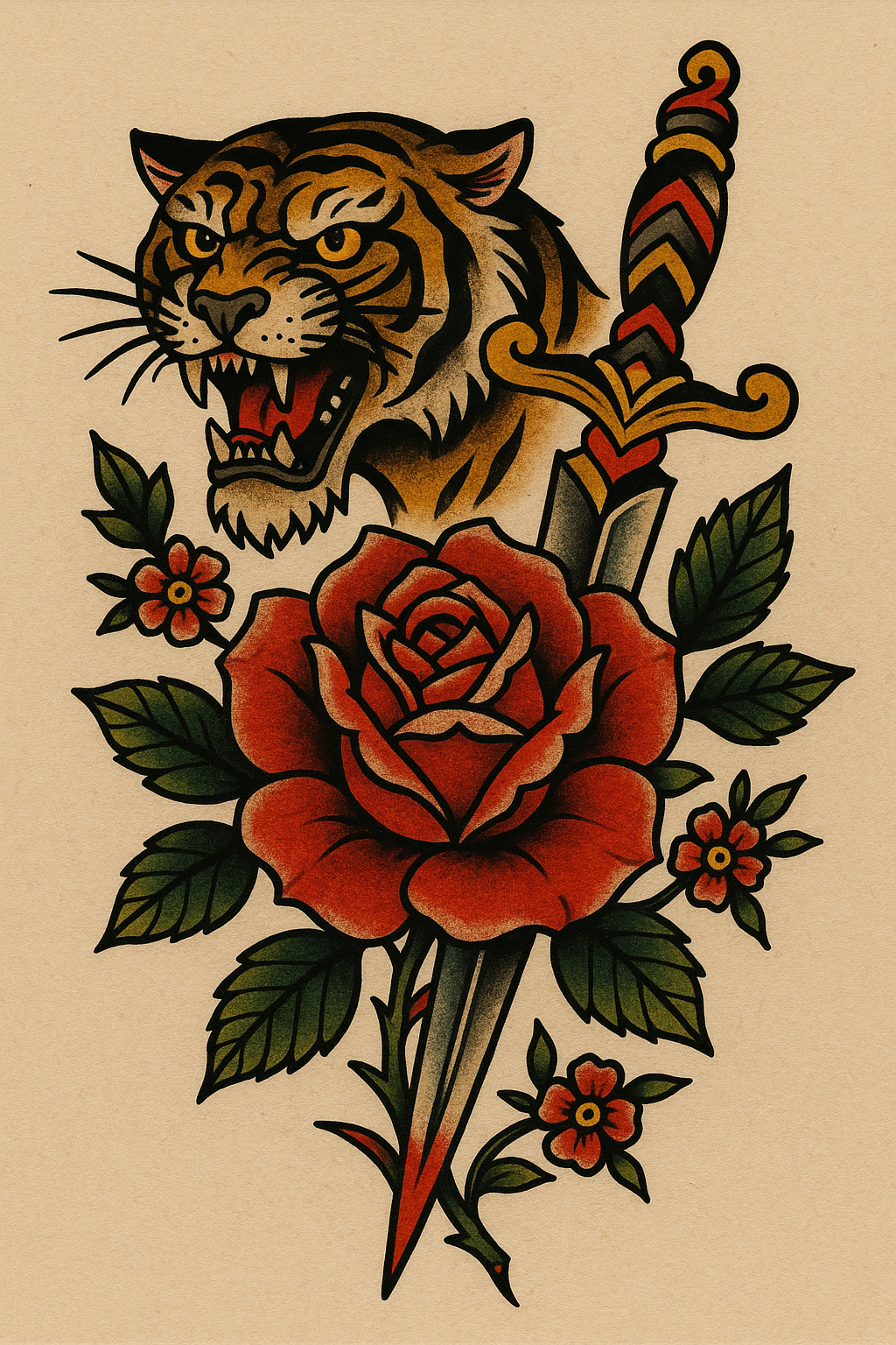 /Collection: /by davooda/Type: PNG/This image showcases a traditional tattoo design with a fierce tiger and a vibrant rose, ideal for tattoo enthusiasts and artists. The bold colors and classic style highlight the craftsmanship.