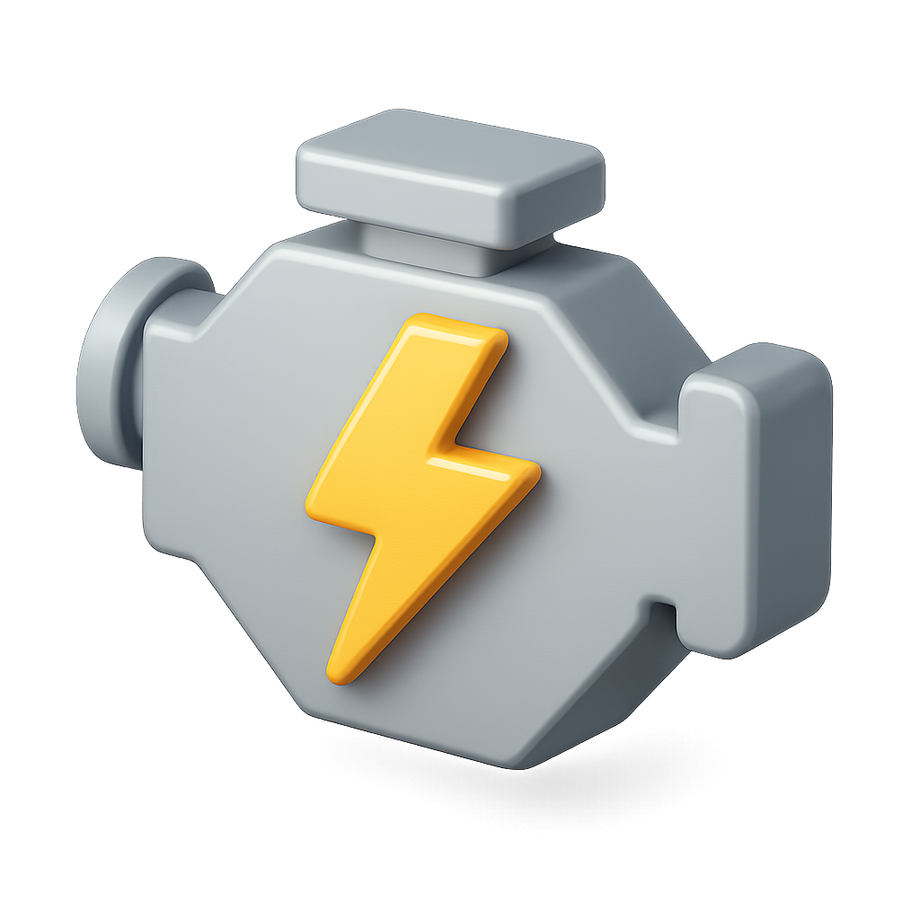 /Collection: /by davooda/Type: PNG/A 3D icon of an engine with a prominent yellow lightning bolt, set against a blurred background. The design emphasizes a modern and sleek look, showcasing volumetric depth.