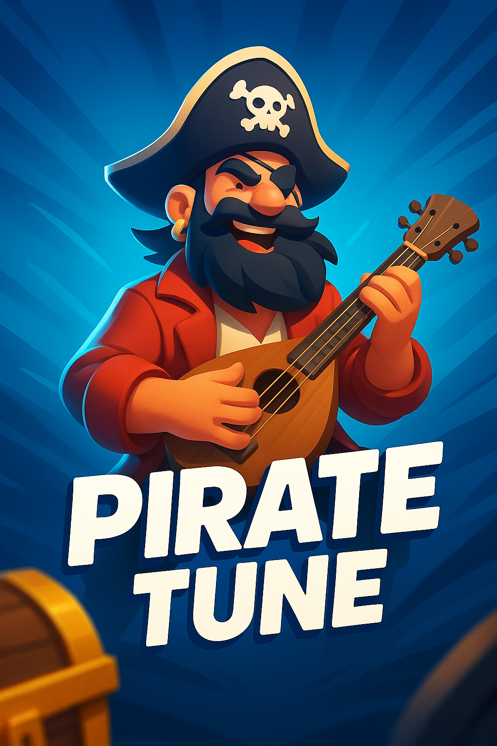 A vibrant 3D illustration of a pirate playing a lute, set against a dynamic blue gradient background. The bold title 'PIRATE TUNE' draws attention, emphasizing the playful theme.