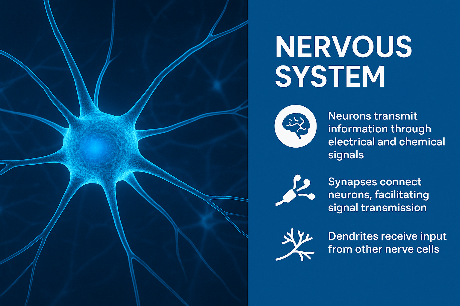 /Collection: /by davooda/Type: PNG/Informative infographic illustrating the nervous system's components, featuring a stylized neuron graphic and key functions, ideal for educational purposes.