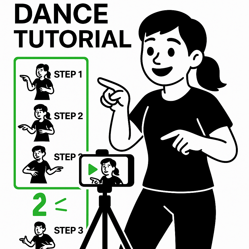 /Collection: /by davooda/Type: PNG/A visual guide for a dance tutorial featuring step-by-step instructions. The graphic uses a minimalist design with clear icons and a playful character, ideal for social media or instructional content.