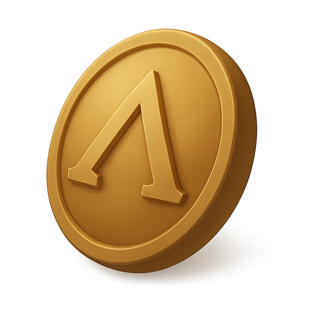 A shiny, golden 3D coin featuring a distinct symbol. The coin's surface reflects light, showcasing its round shape and embossed design, ideal for digital projects.