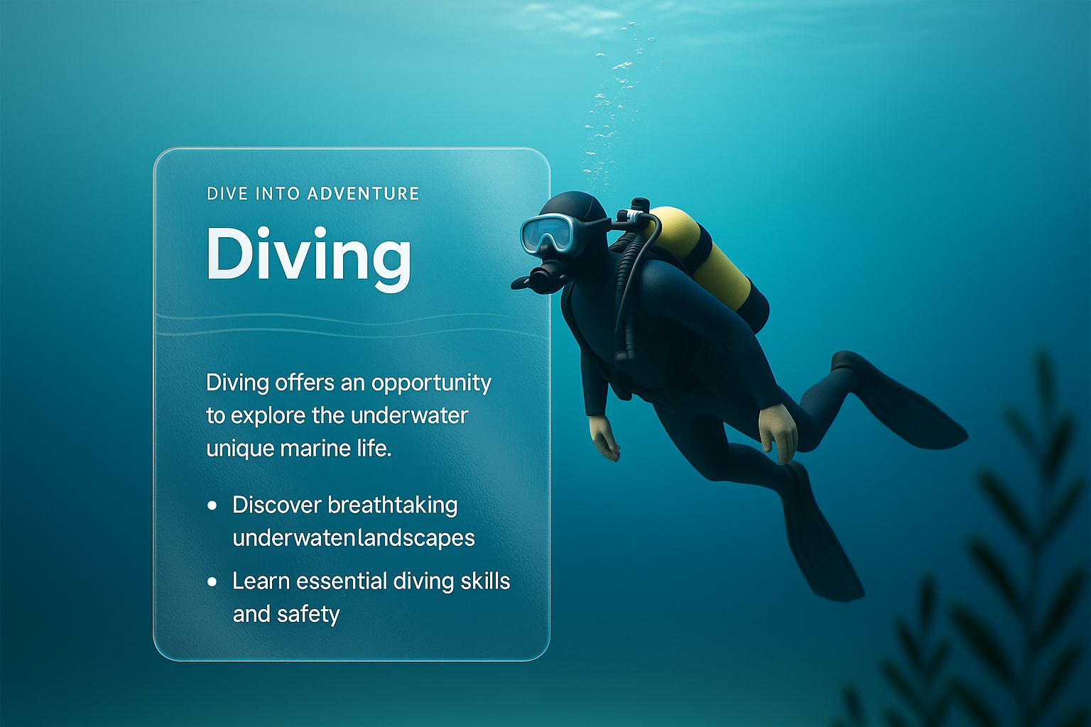 /Collection: /by davooda/Type: PNG/A 3D illustration showcasing a diver exploring underwater landscapes. The design features a transparent panel with engaging text about diving, emphasizing adventure and safety.