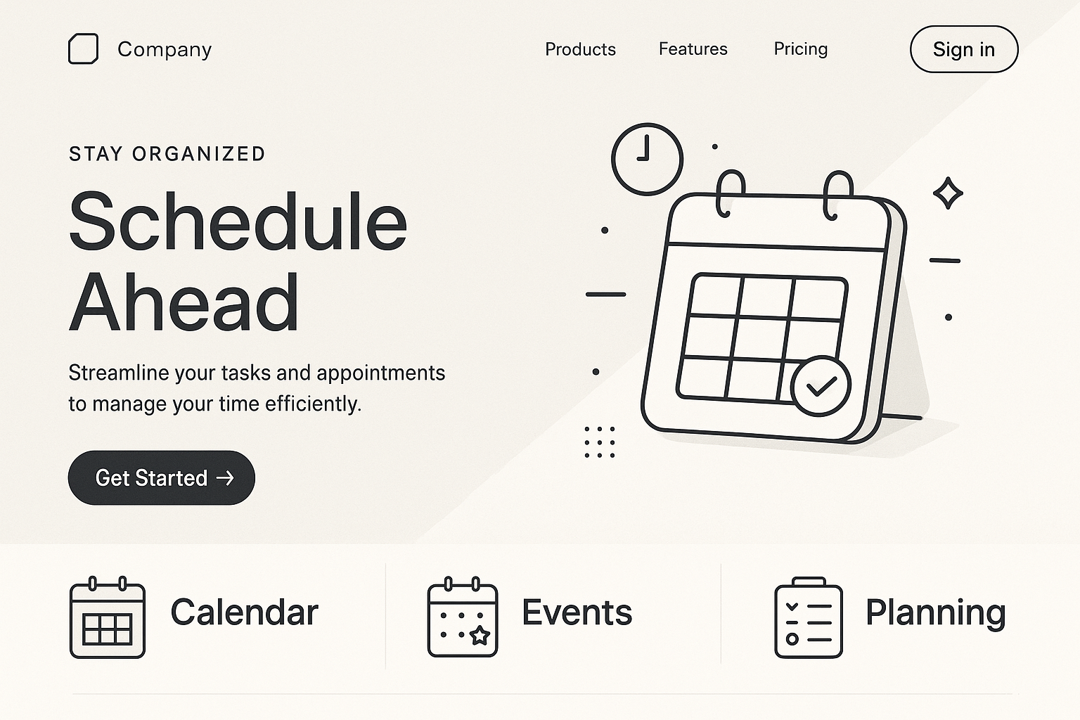 /Collection: /by davooda/Type: PNG/A clean and modern landing page featuring a geometric logo and calendar illustration. The layout includes sections for products, features, and pricing with a focus on task management.