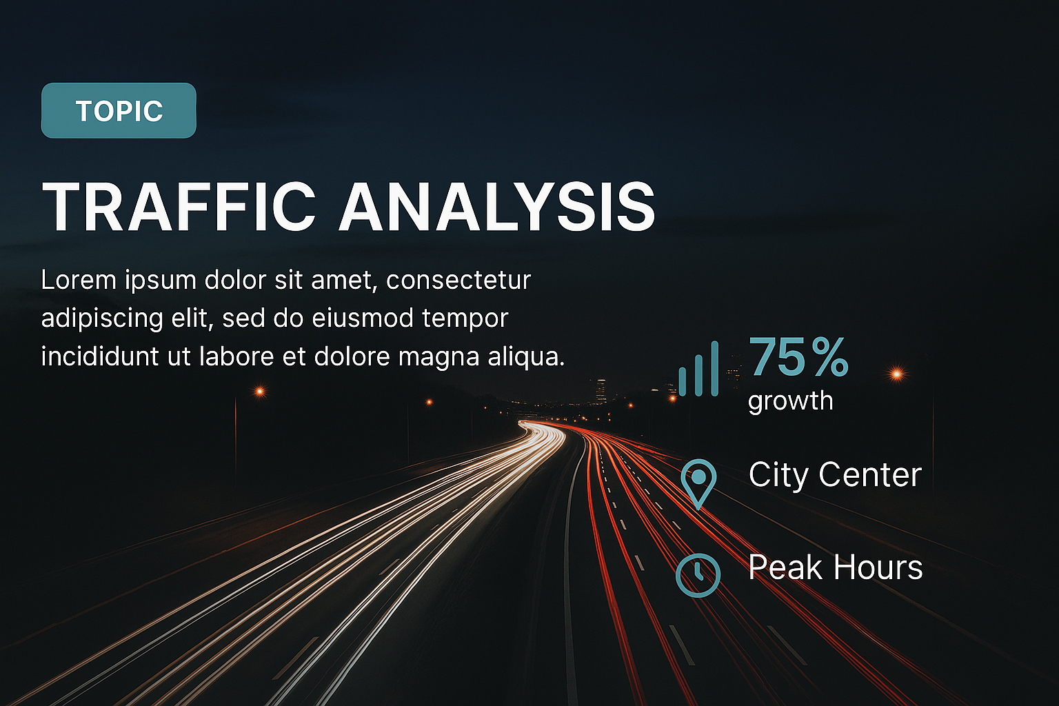 Informative infographic presenting traffic analysis data, featuring a sleek design with visual elements like growth percentages, locations, and peak hours. Ideal for urban planning or transportation studies.