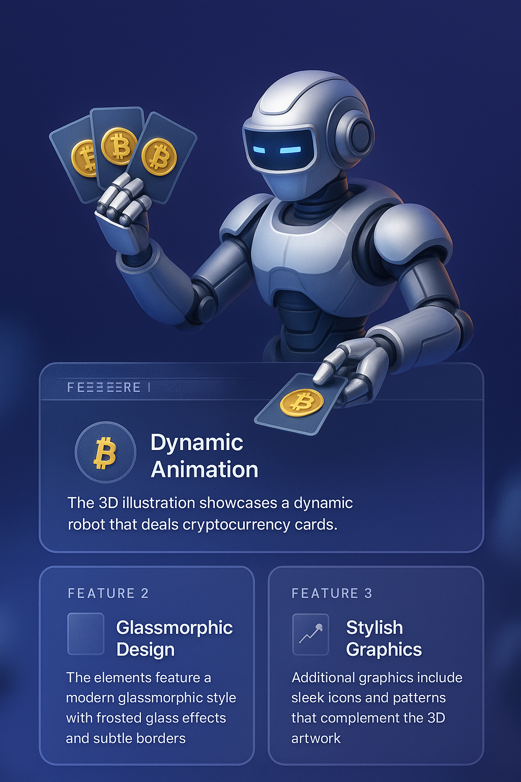 A 3D illustration of a futuristic robot dealer distributing cryptocurrency cards, set against a smooth gradient background. The design features modern glass effects and stylish graphics.