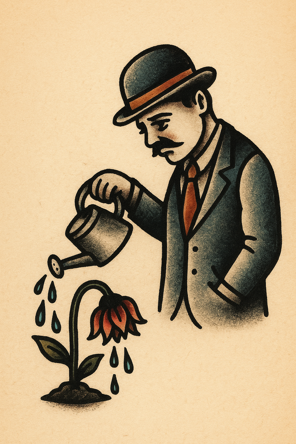 A classic tattoo design depicting a man in a suit watering a wilted flower. The illustration symbolizes futile hopes, set against a light beige background.