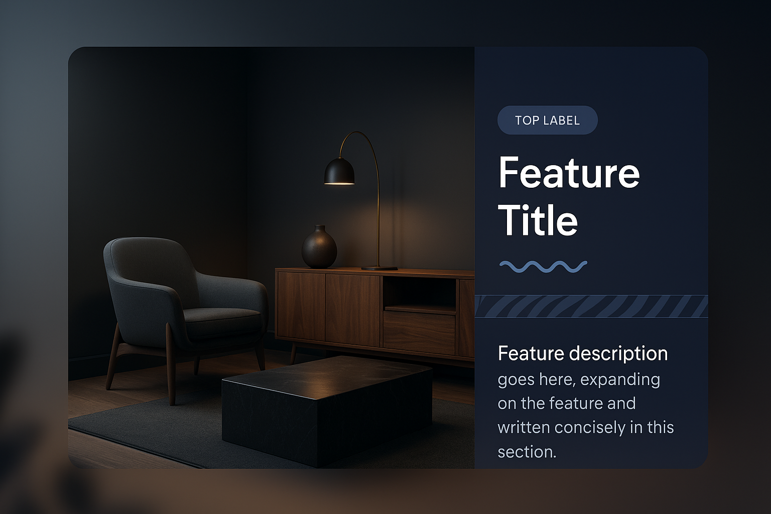 /Collection: /by davooda/Type: PNG/A sophisticated living room interior featuring black walls, a stylish chair, and a wooden console. The design integrates a feature block with a top label and detailed description.