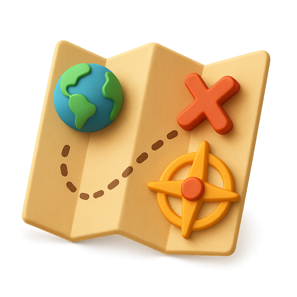 /Collection: /by davooda/Type: PNG/A colorful 3D adventure map icon featuring a globe, an 'X' mark, and a compass symbol on a folded map design. The icon has a transparent background and a volumetric isometric style.