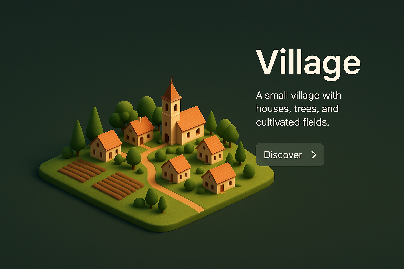 A detailed 3D representation of a quaint village, featuring houses, trees, and fields. The design emphasizes realism and a cohesive layout with an inviting atmosphere.