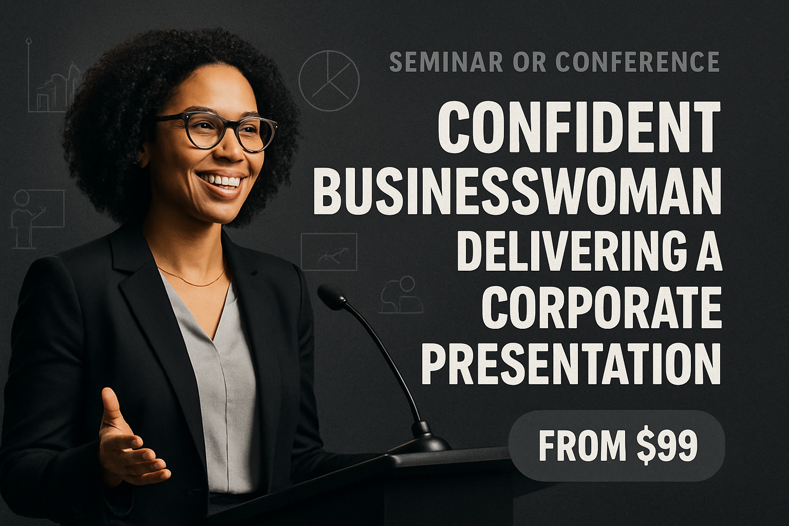 /Collection: /by davooda/Type: PNG/A confident businesswoman delivers a corporate presentation at a seminar, showcasing her leadership skills with bold typography and a dynamic layout. The modern design features a light textured background with simple contour drawings, enhancing professionalism.