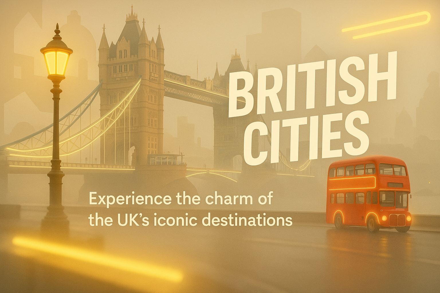 /Collection: /by davooda/Type: PNG/A vibrant travel promotional banner showcasing the charm of iconic British cities with a classic red double-decker bus and a misty London backdrop, perfect for tourism marketing.