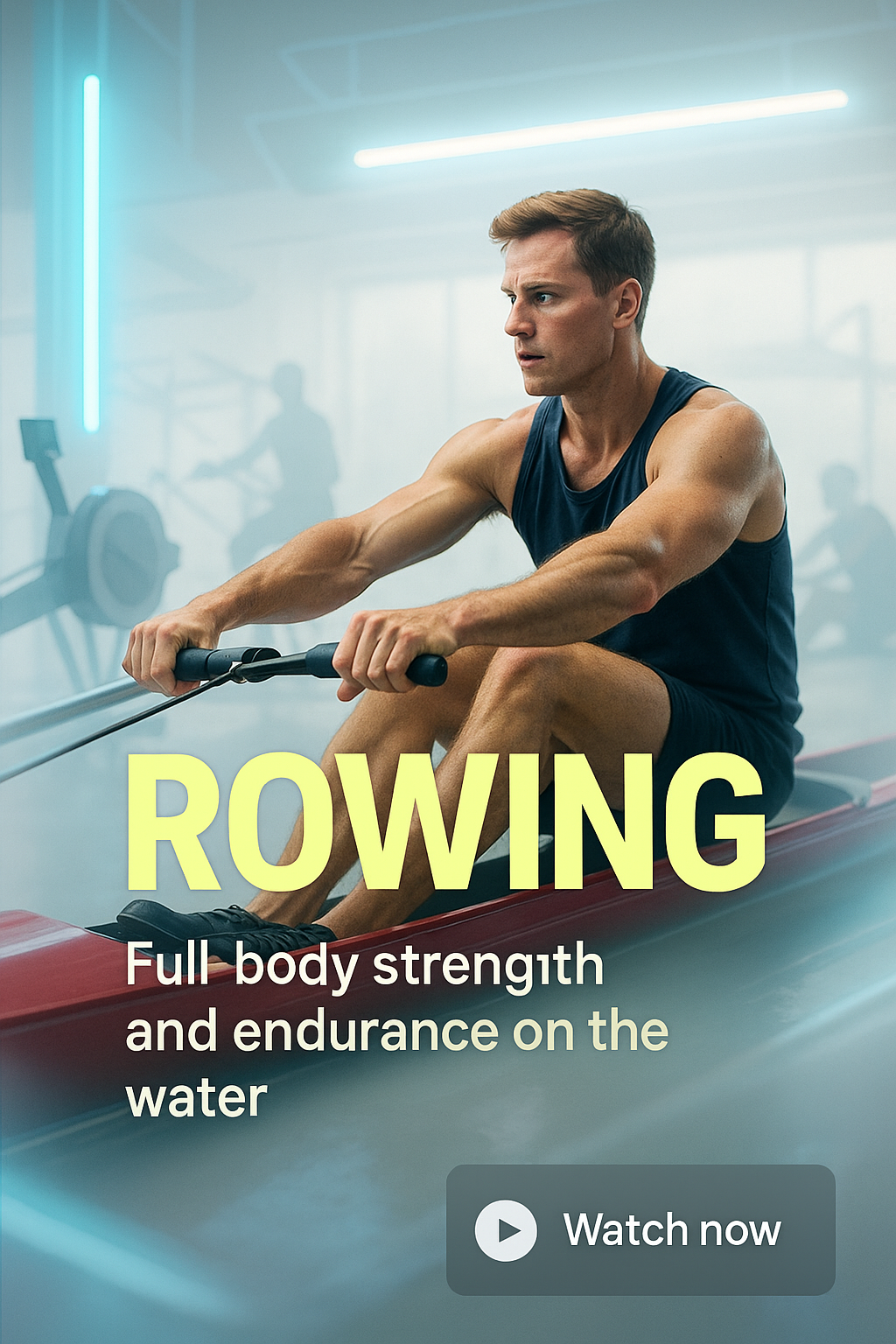Promotional image depicting a man rowing, emphasizing full-body strength and endurance. Ideal for fitness campaigns and online workout programs.