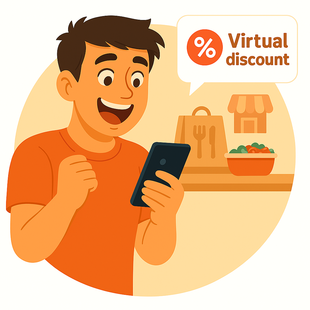 /Collection: /by davooda/Type: PNG/Illustrative graphic depicting a joyful customer using a smartphone to access a virtual discount, set in a food-related environment, ideal for promotional campaigns.