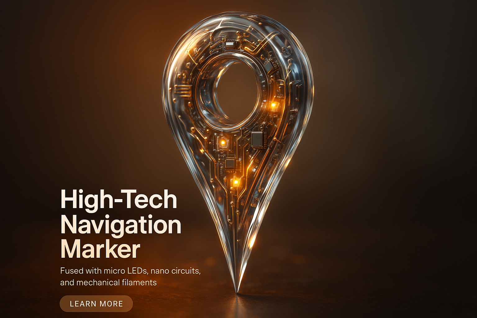 /Collection: /by davooda/Type: PNG/A hyperrealistic 3D rendering of a navigation marker, showcasing intricate details like micro LEDs and circuit boards embedded in clear glass-like polymers, illuminated by soft neon lighting.