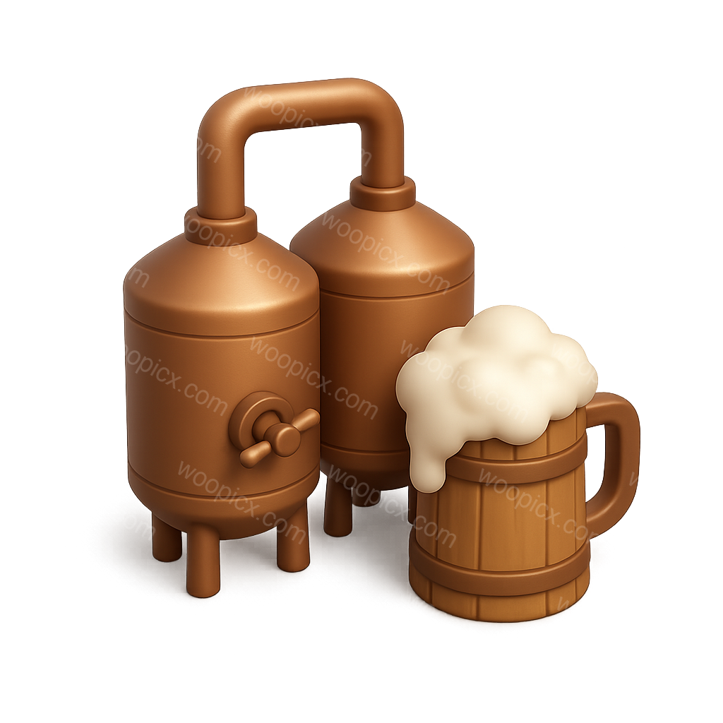 A 3D design featuring brewery equipment with two copper fermentation tanks and a wooden beer mug overflowing with foam, set against a soft gradient background.
