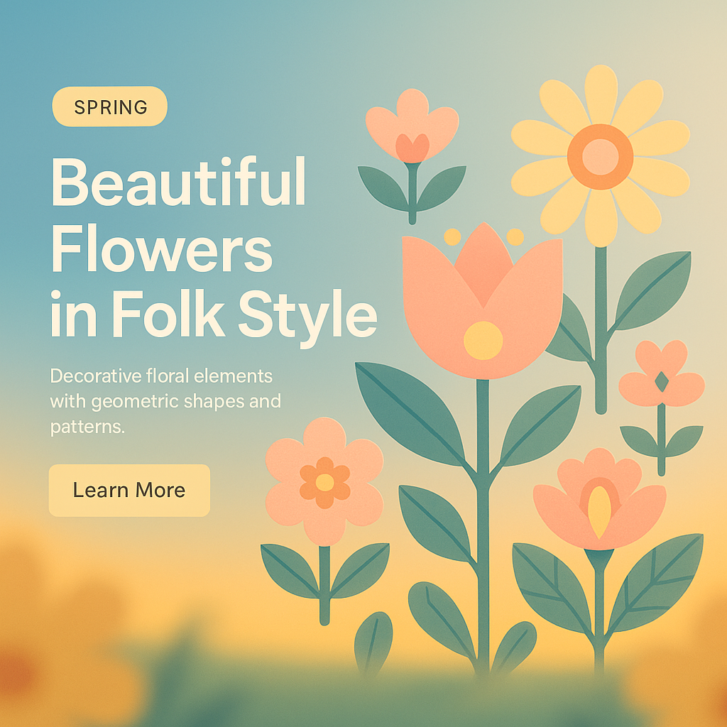 /Collection: /by davooda/Type: PNG/A vibrant illustration featuring pastel-colored flowers and leaves in a folk geometric style. The design exudes a spring and summer theme, perfect for engaging visuals.