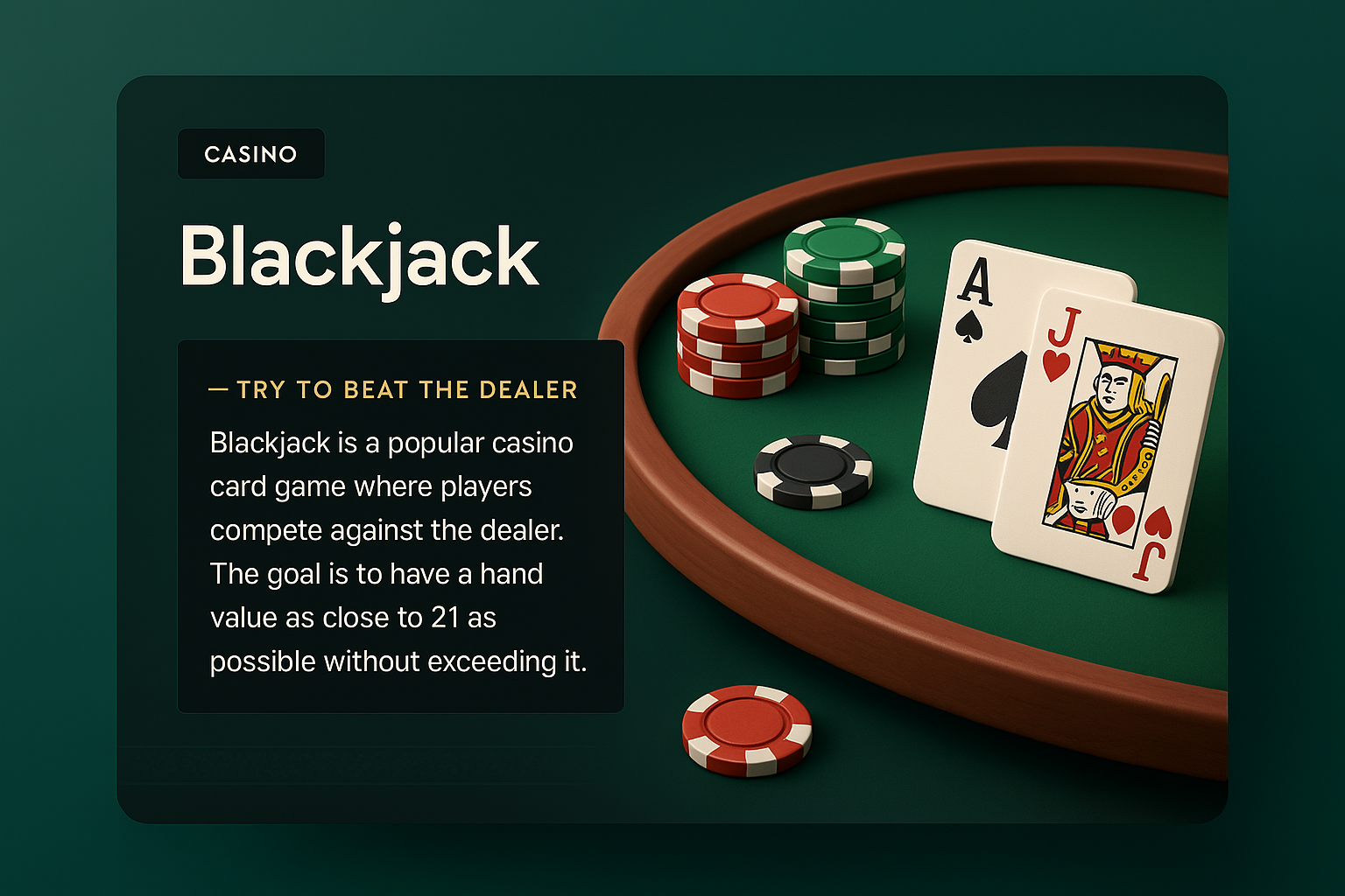 /Collection: /by davooda/Type: PNG/A vibrant 3D illustration of a blackjack table featuring cards, chips, and a stylish dark banner with text. The design integrates smoothly with a gradient background for a cohesive look.