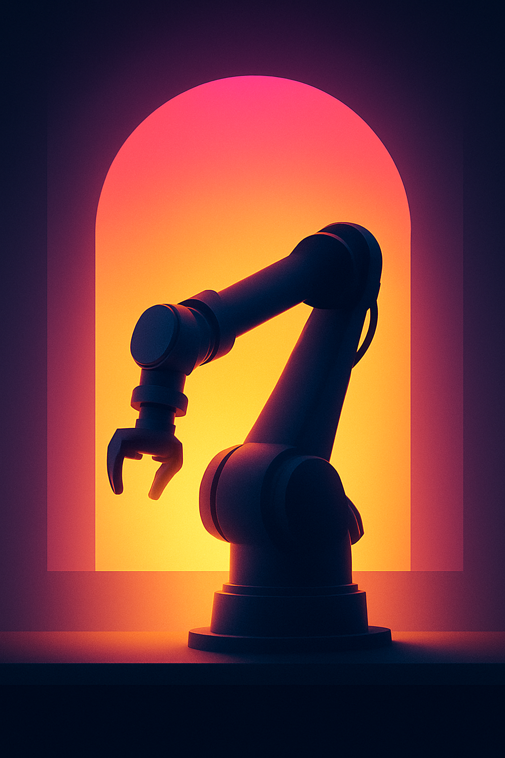 A stylized illustration of an industrial robot illuminated by a vibrant gradient background. The robot's silhouette is accentuated by backlighting, creating a modern, futuristic aesthetic.