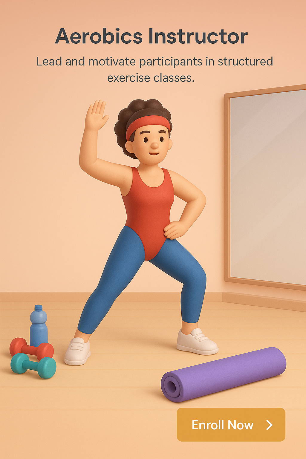 /Collection: /by davooda/Type: PNG/A vibrant 3D illustration of an aerobics instructor leading a class. The scene features exercise equipment and a mirror, emphasizing a realistic training environment.