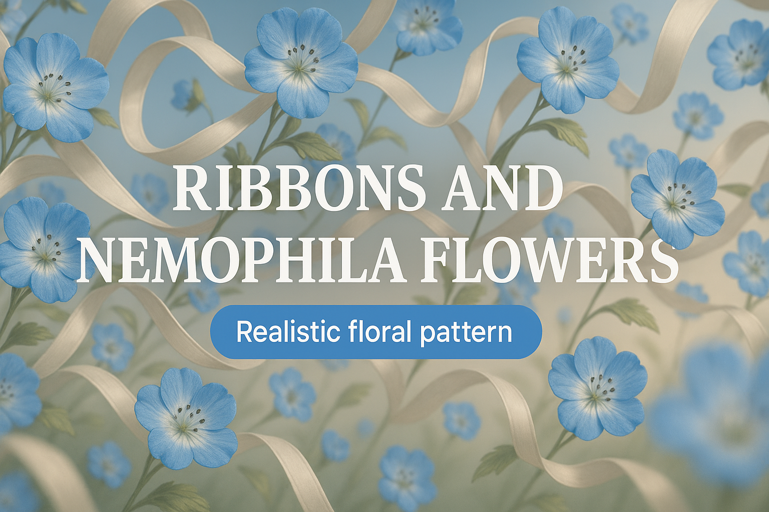 /Collection: /by davooda/Type: PNG/A beautifully designed floral pattern showcasing realistic nemophila flowers intertwined with soft ribbons, perfect for greeting cards or fabric designs.