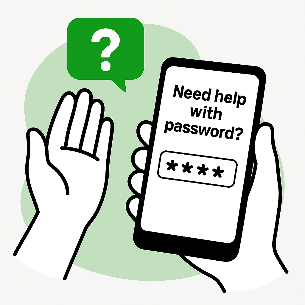 Simple graphic depicting a hand holding a smartphone with a password prompt, conveying the theme of password assistance. Ideal for tech support or security-related content.
