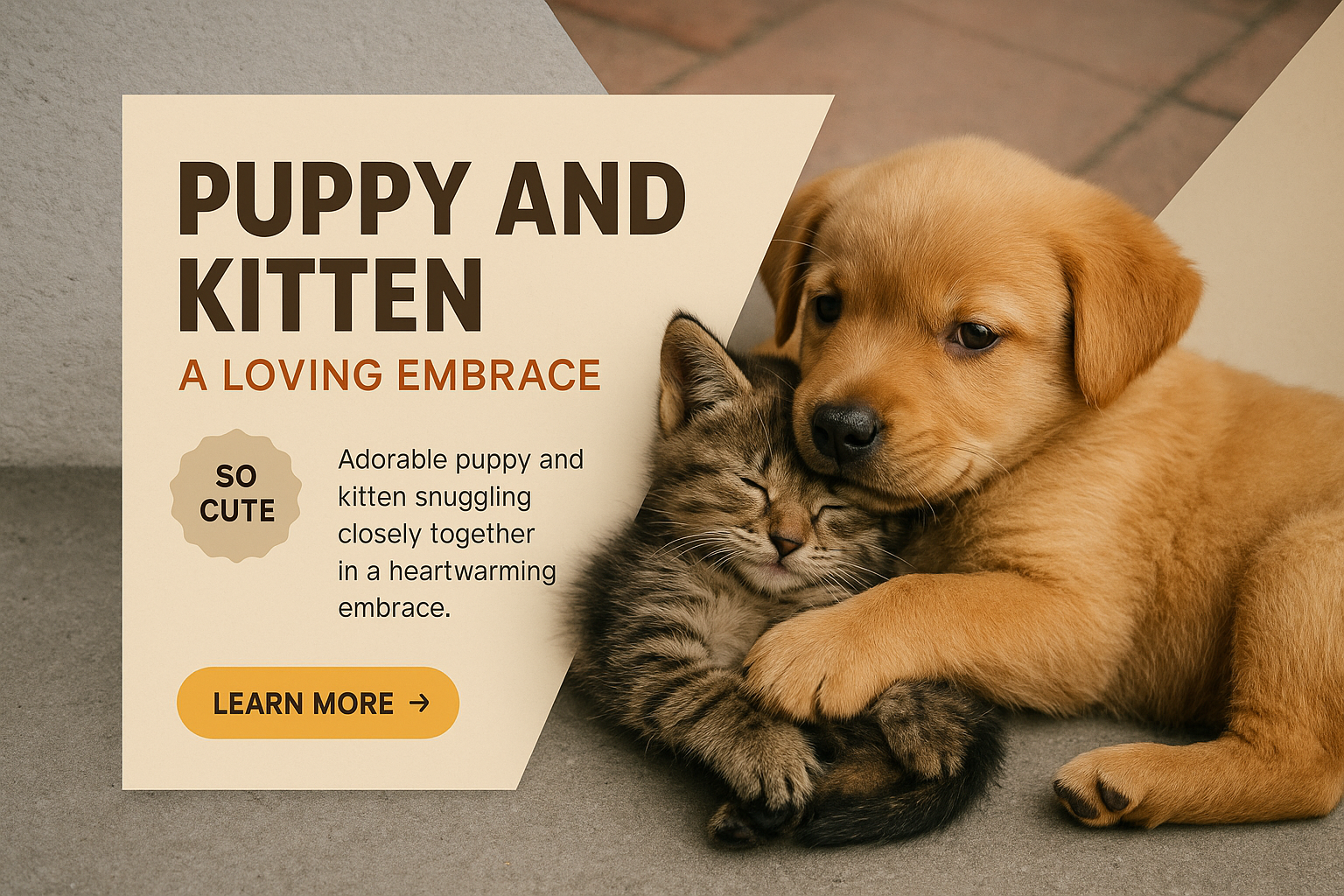 A heartwarming scene featuring a cute puppy and kitten snuggled closely together, showcasing their affectionate bond. The composition blends warm colors with a cozy background.