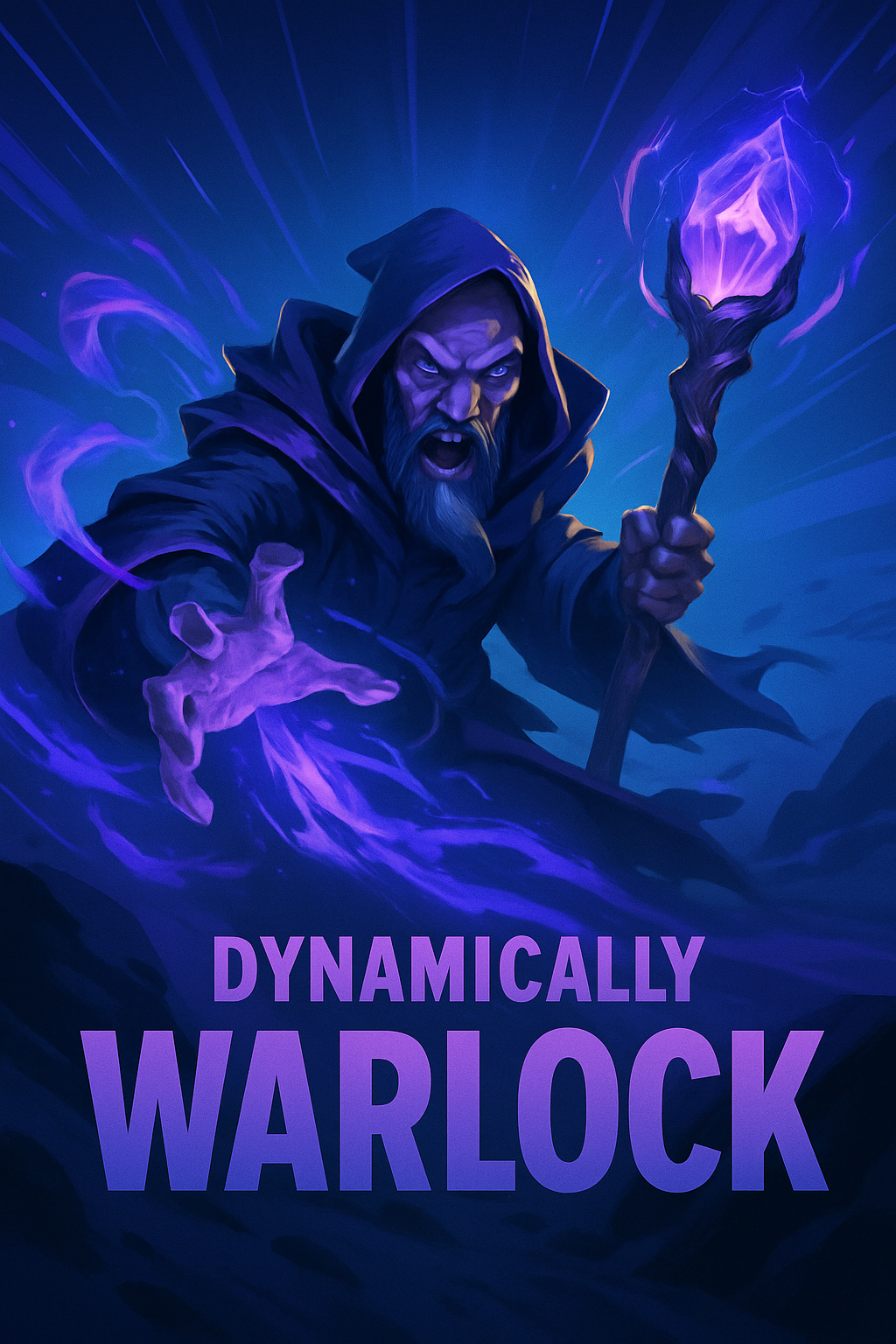 A powerful warlock casts a spell with swirling purple magic emanating from his staff. The dramatic pose and vibrant colors create a captivating scene filled with energy.