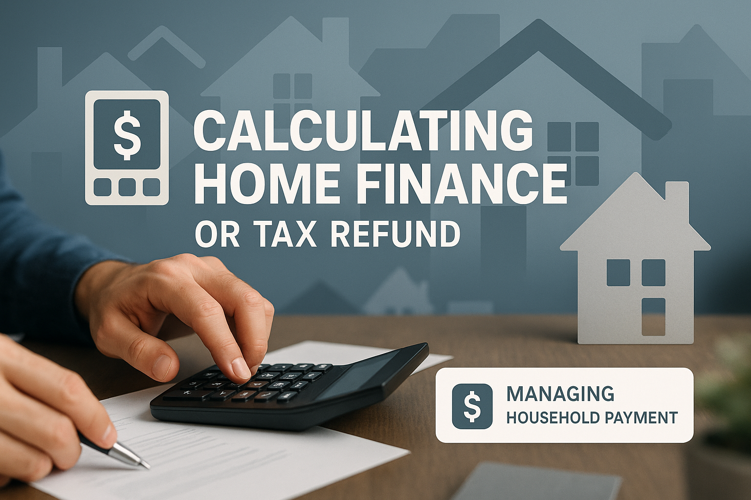 Informative graphic featuring a person using a calculator to manage home finances, ideal for financial services and household budgeting content.