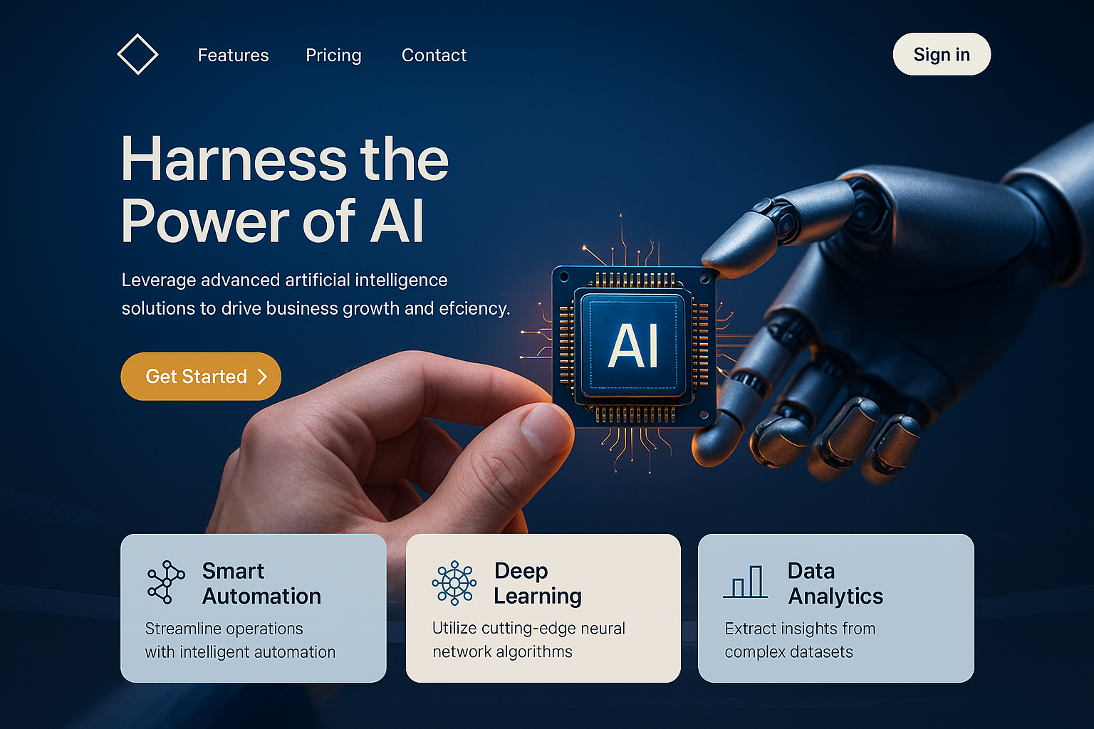 /Collection: /by davooda/Type: PNG/A visually engaging AI landing page featuring a human hand and robotic hand interacting with a chip, showcasing advanced technology and machine learning. The layout includes informative blocks and a call-to-action button.