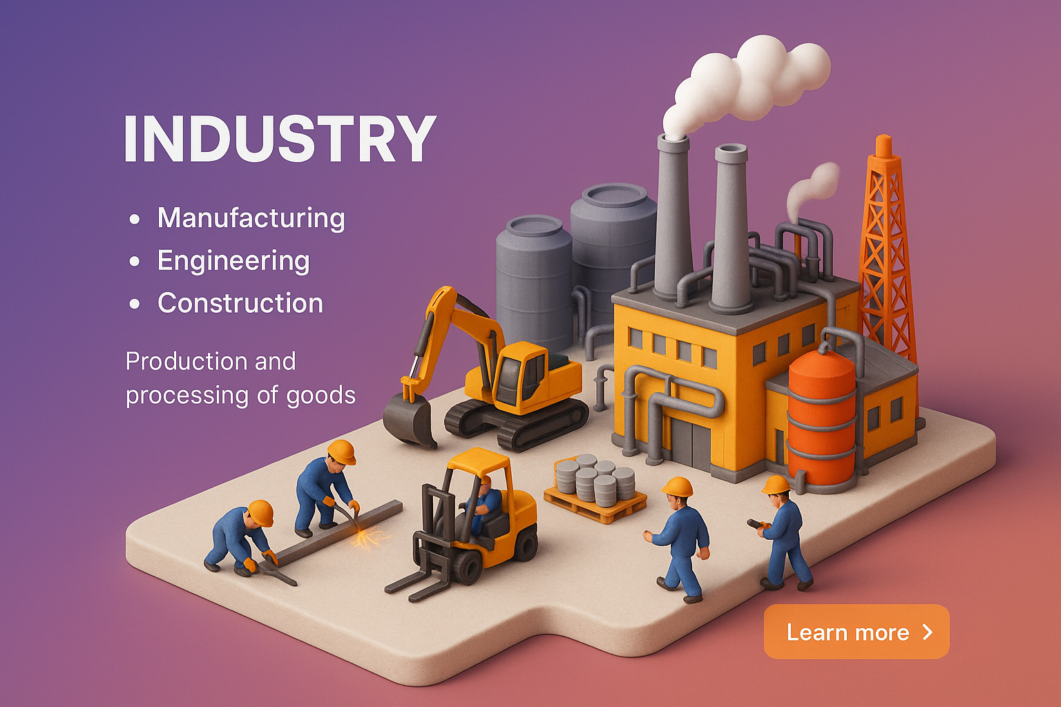 /Collection: /by davooda/Type: PNG/A vibrant 3D depiction of an industrial setting showcasing small figures engaged in manufacturing tasks. The scene features machinery, smokestacks, and a colorful background.