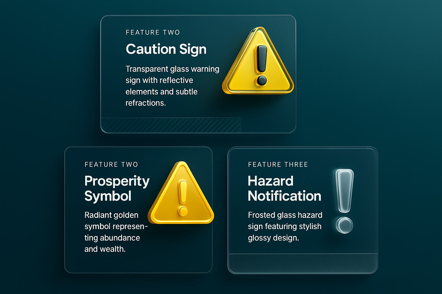 A visually striking representation of caution warning signs in 3D. Features transparent glass effects, reflective elements, and a modern design, suitable for web use.