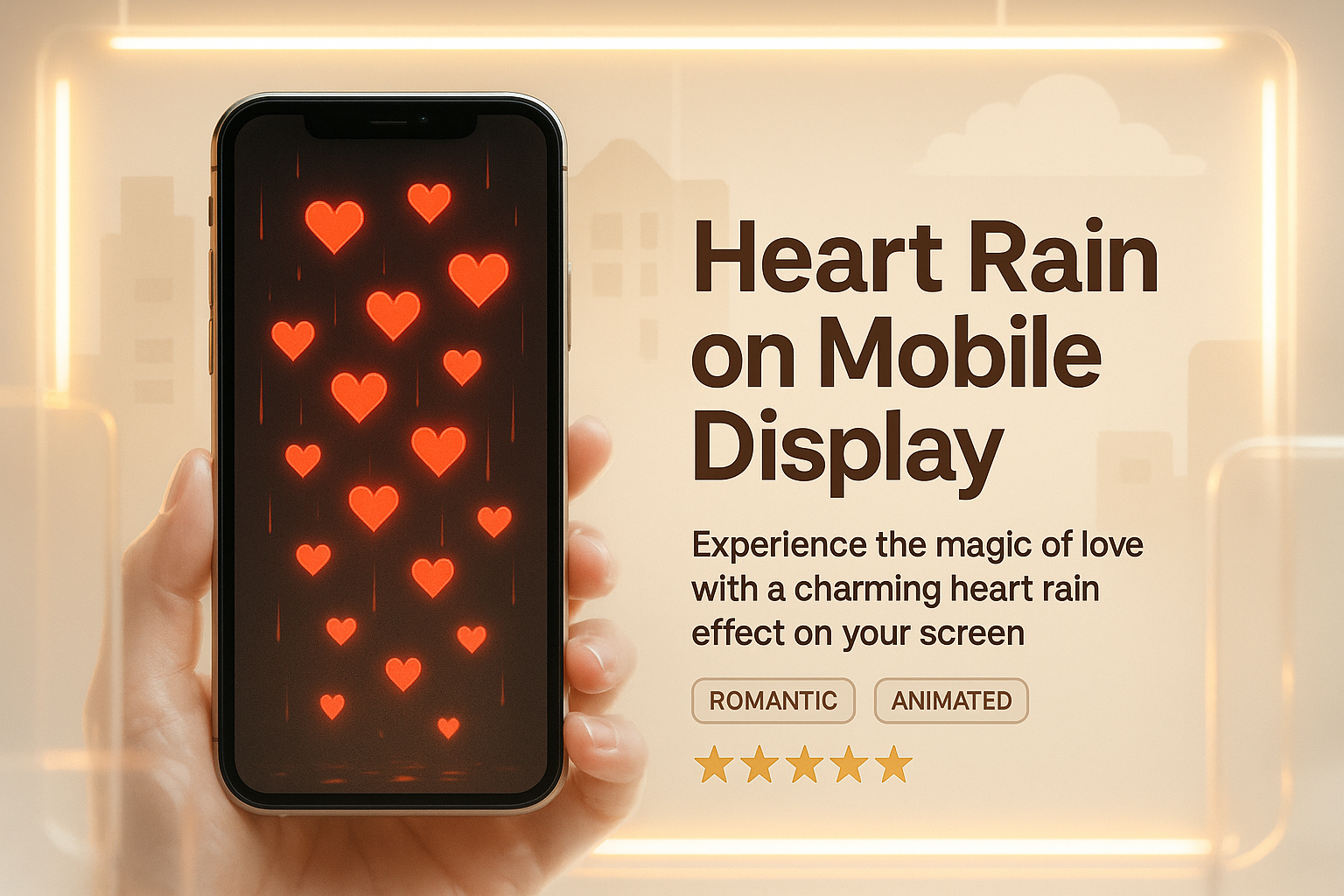 Charming mobile display mockup showcasing a heart rain animation, ideal for romantic-themed applications or marketing materials. The design features a modern smartphone held against a soft-lit background.