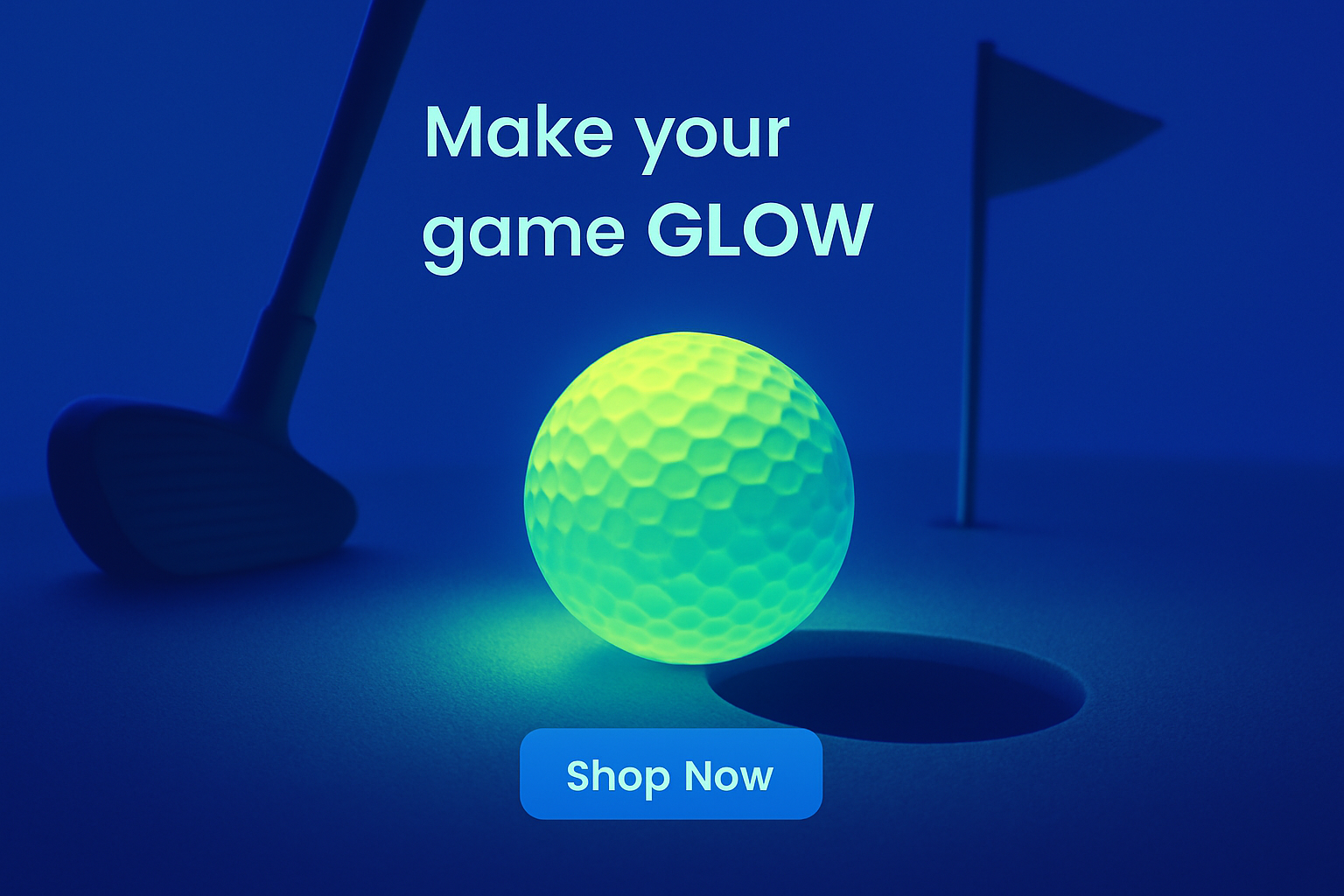 A vibrant golf scene featuring a luminous golf ball emitting a soft green glow against a solid blue background. The glowing ball enhances the atmosphere, creating a captivating visual.