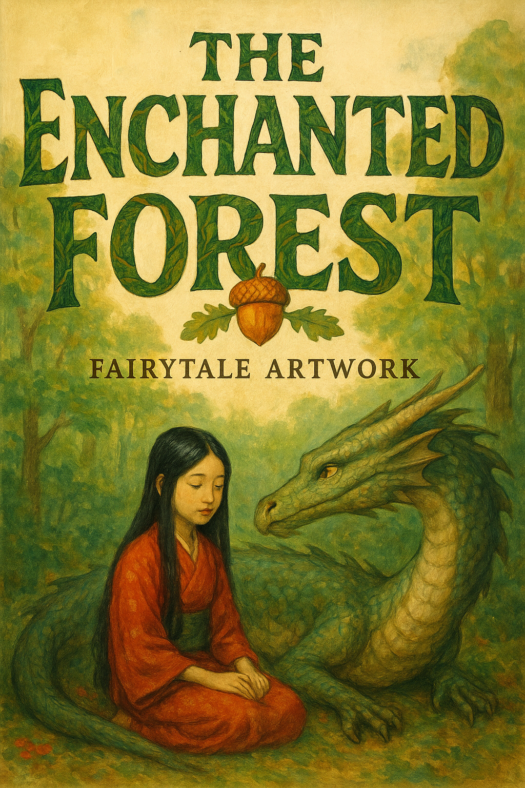 A beautifully illustrated book cover depicting a serene scene with a girl and a dragon in an enchanted forest, perfect for a fairytale theme.