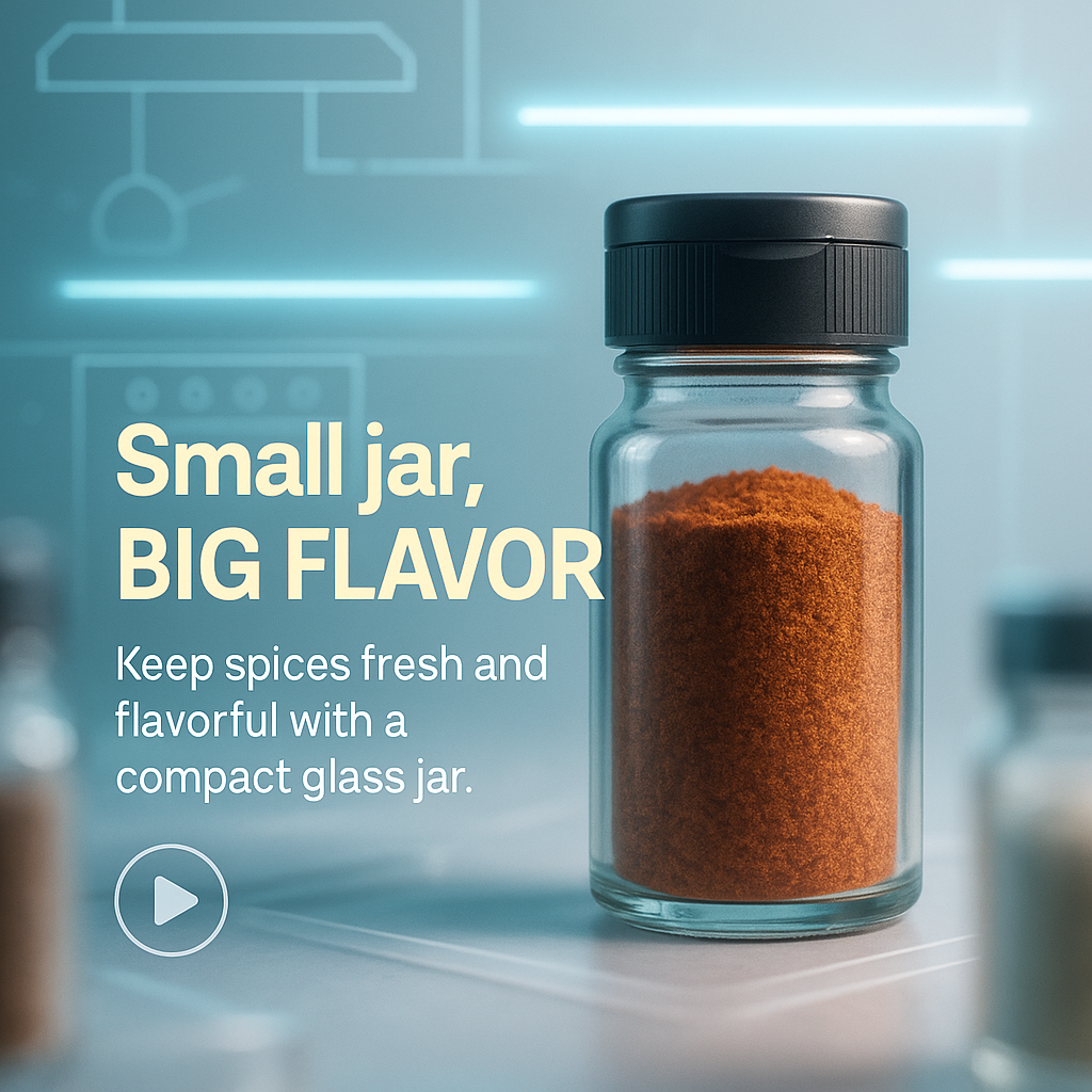 Promotional image featuring a compact glass spice jar with a modern design, ideal for showcasing culinary products. The clean background enhances the focus on the jar.