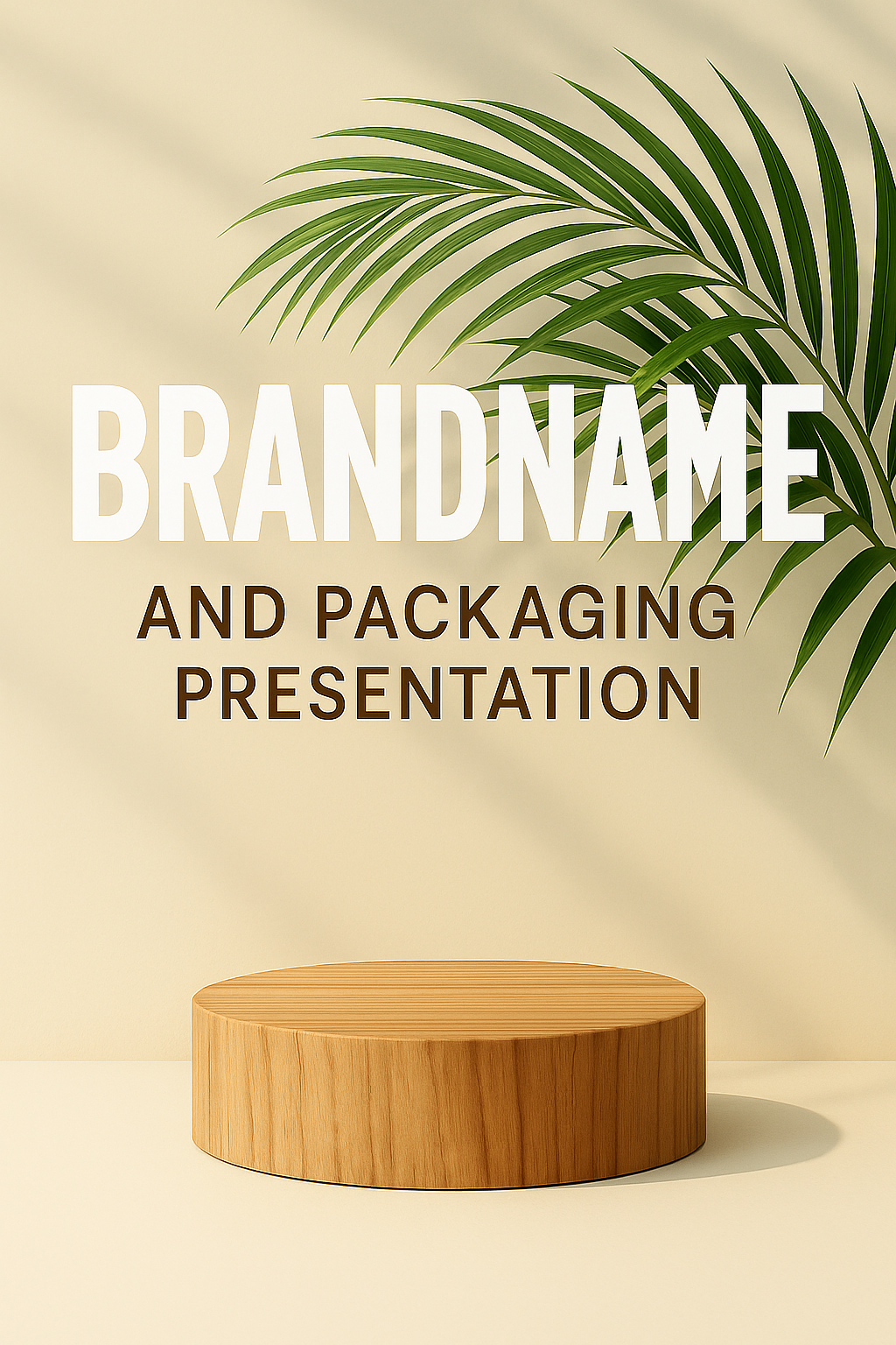 Stylish product display mockup featuring a wooden pedestal against a soft background, enhanced by a palm leaf, ideal for branding and packaging presentations.