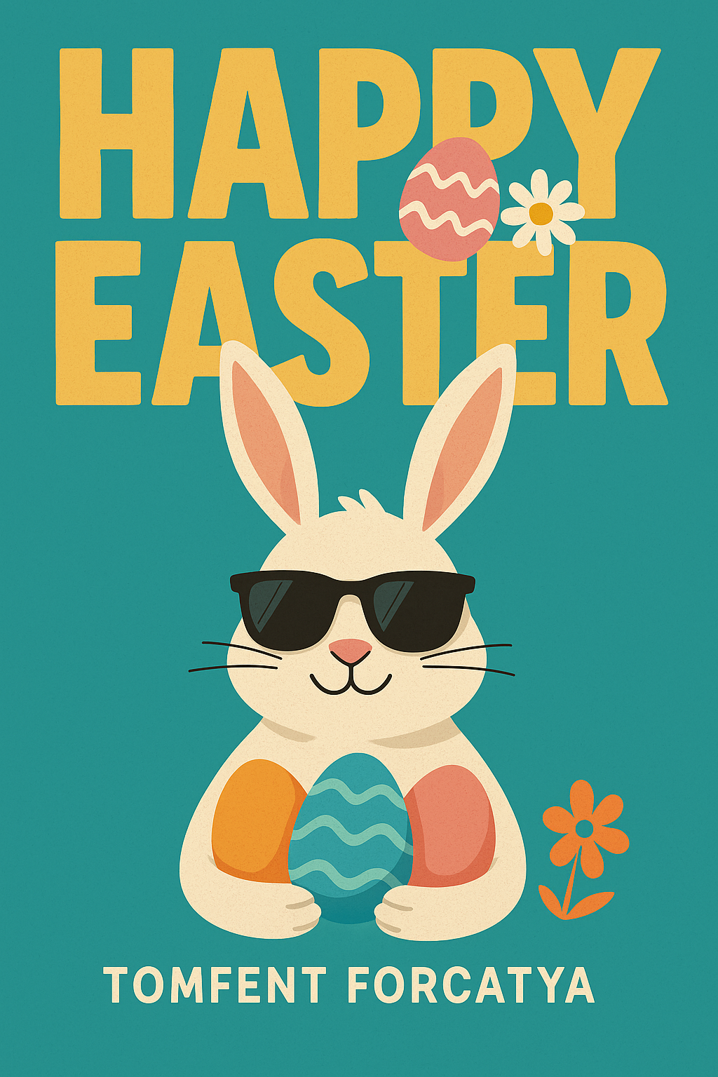 /Collection: /by davooda/Type: PNG/Colorful Easter greeting card illustration showcasing a cartoon bunny in sunglasses holding an Easter egg, designed to evoke fun and joy for holiday celebrations.