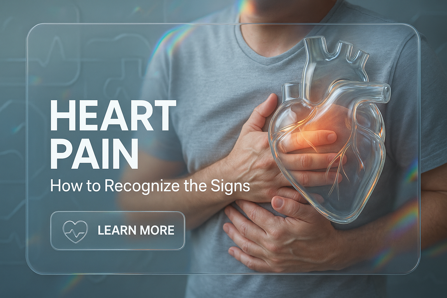 /Collection: /by davooda/Type: PNG/Engaging health awareness graphic focusing on recognizing heart pain signs. Features a modern design with a translucent heart illustration, ideal for educational content.