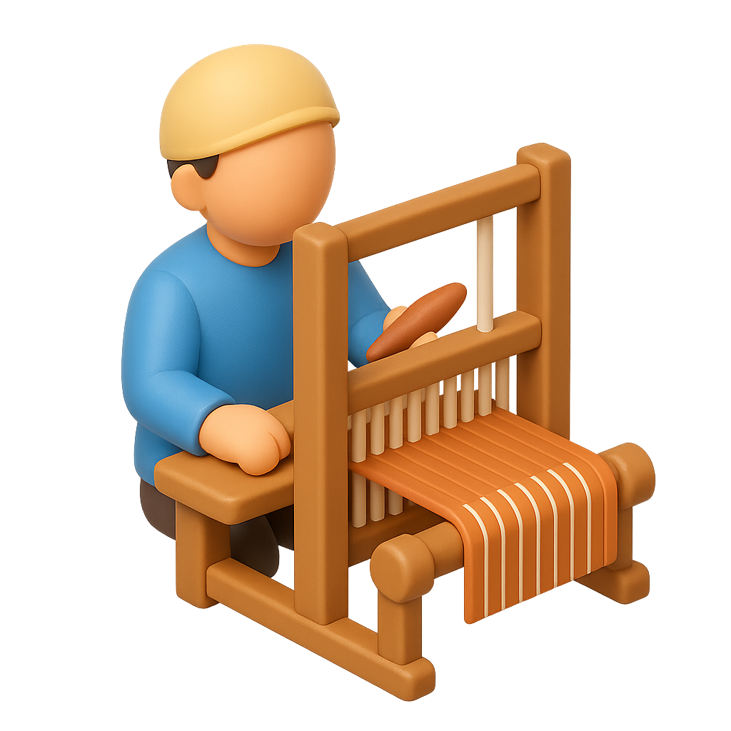 /Collection: /by davooda/Type: PNG/A stylized 3D icon of a weaver at a loom, featuring a bright color palette. The figure is depicted in a three-quarter view, highlighting the weaving process on a wooden frame.