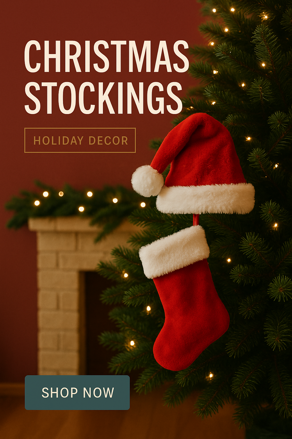 A promotional image showcasing red Christmas stockings with white trim, hanging from a decorated Christmas tree, ideal for holiday decor marketing.