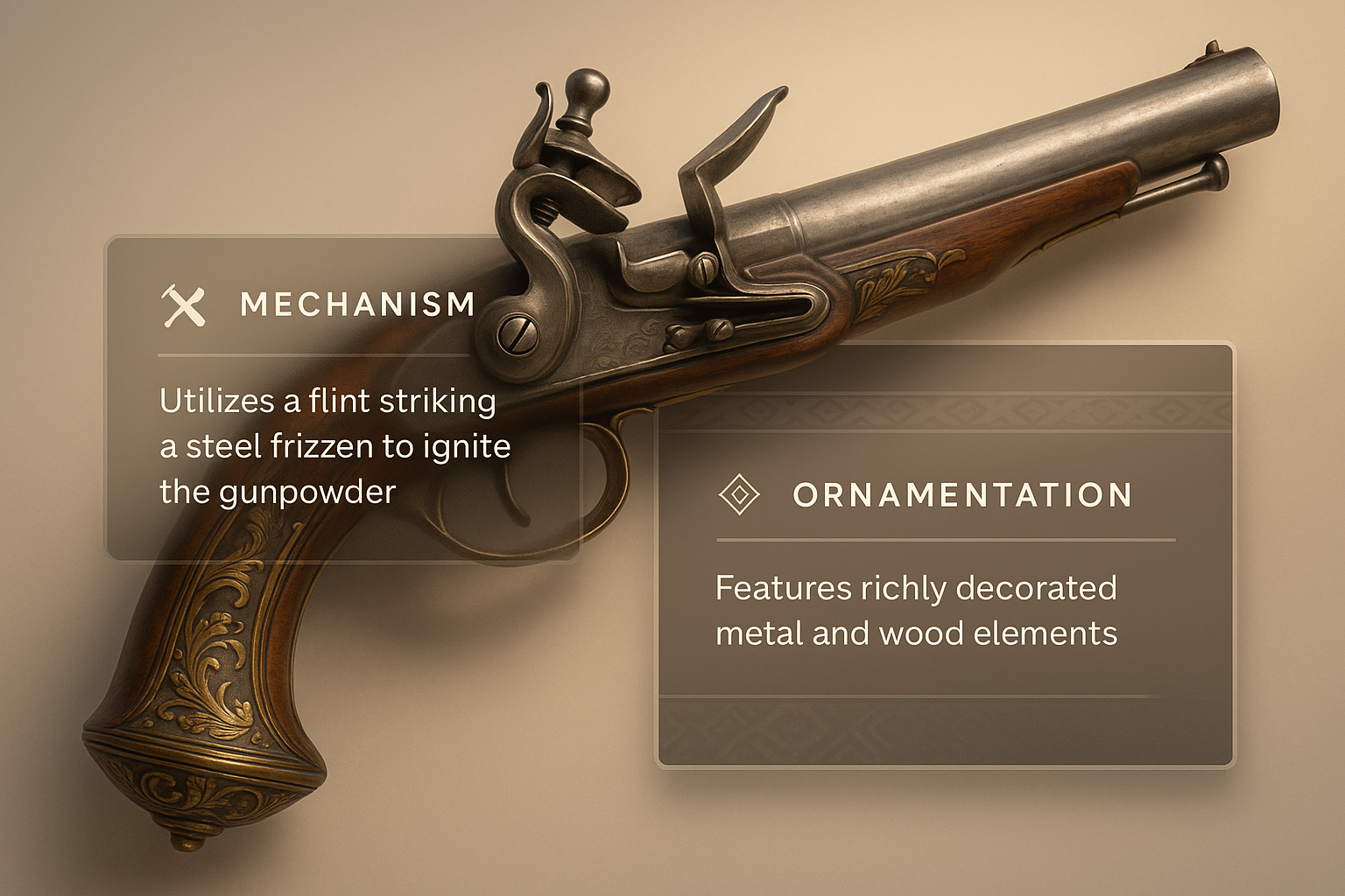 /Collection: /by davooda/Type: PNG/A detailed illustration of a flintlock pistol showcasing intricate metalwork and wood accents. The design features translucent overlays with text blocks, highlighting its mechanism and ornamentation.