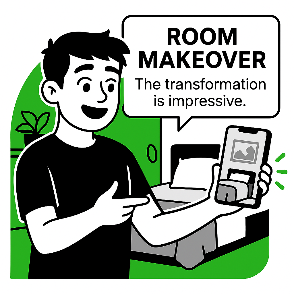 A vibrant graphic illustrating a person excitedly showcasing a room transformation on their phone, ideal for home improvement or interior design marketing.