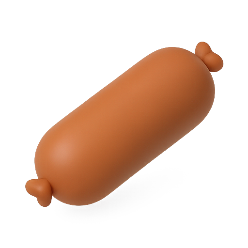 A playful 3D illustration of a cartoon sausage, featuring a smooth, rounded shape and a warm brown color. Ideal for food-related content or playful branding.