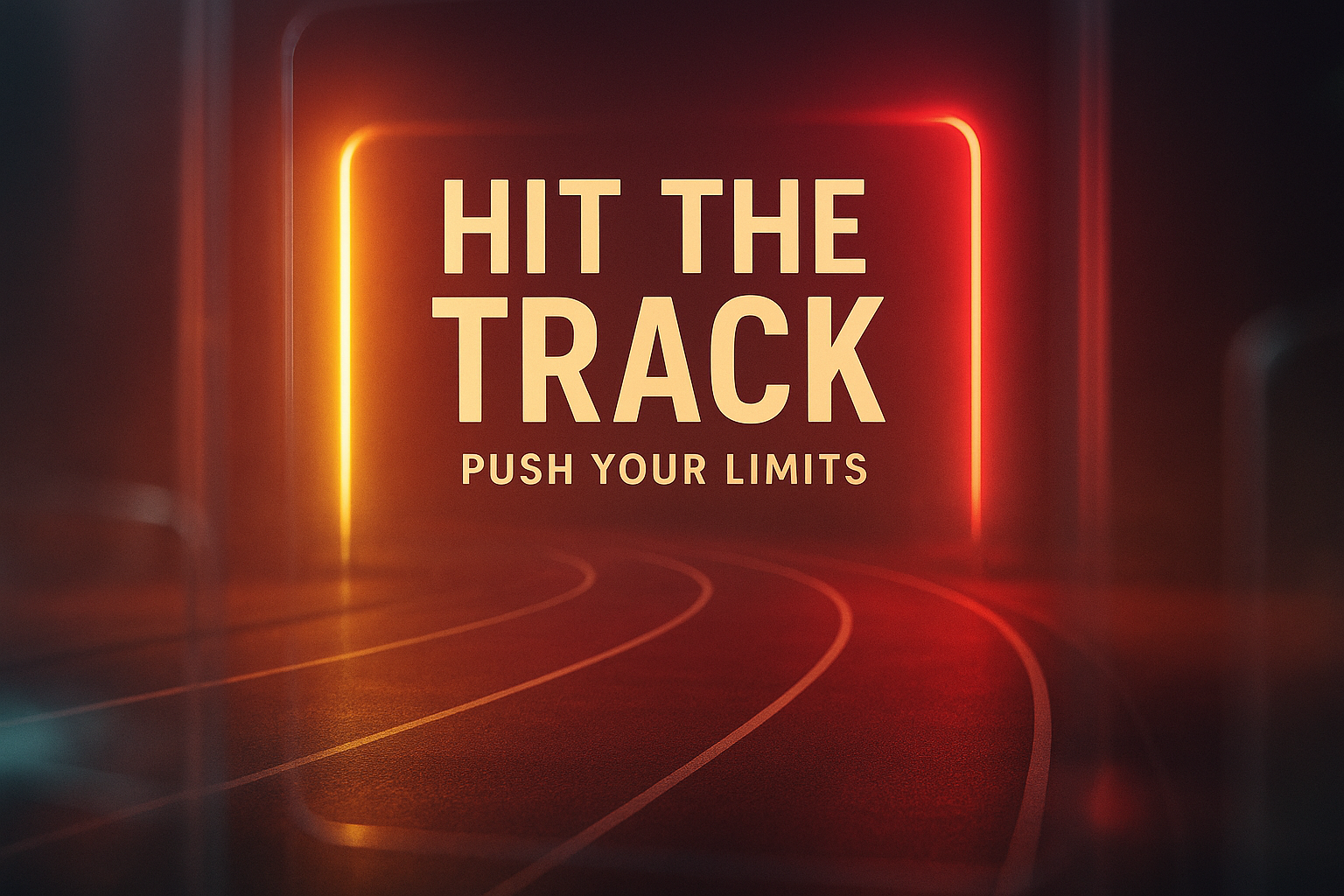 /Collection: /by davooda/Type: PNG/A dynamic image featuring a glowing neon track with the phrase 'Hit the Track' highlighted in vibrant colors. The soft halo effect and translucent elements create depth, emphasizing a motivational theme.