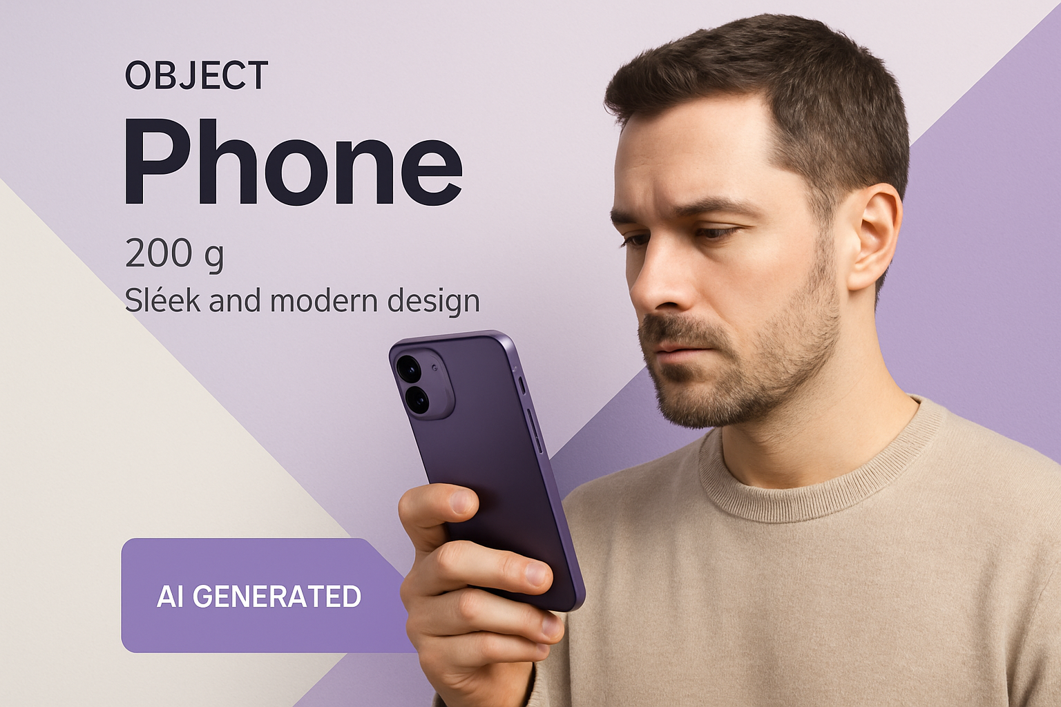 A man examines a sleek phone against a vibrant purple background. The design features dynamic color fields and prominent typography, emphasizing the product's modern attributes.