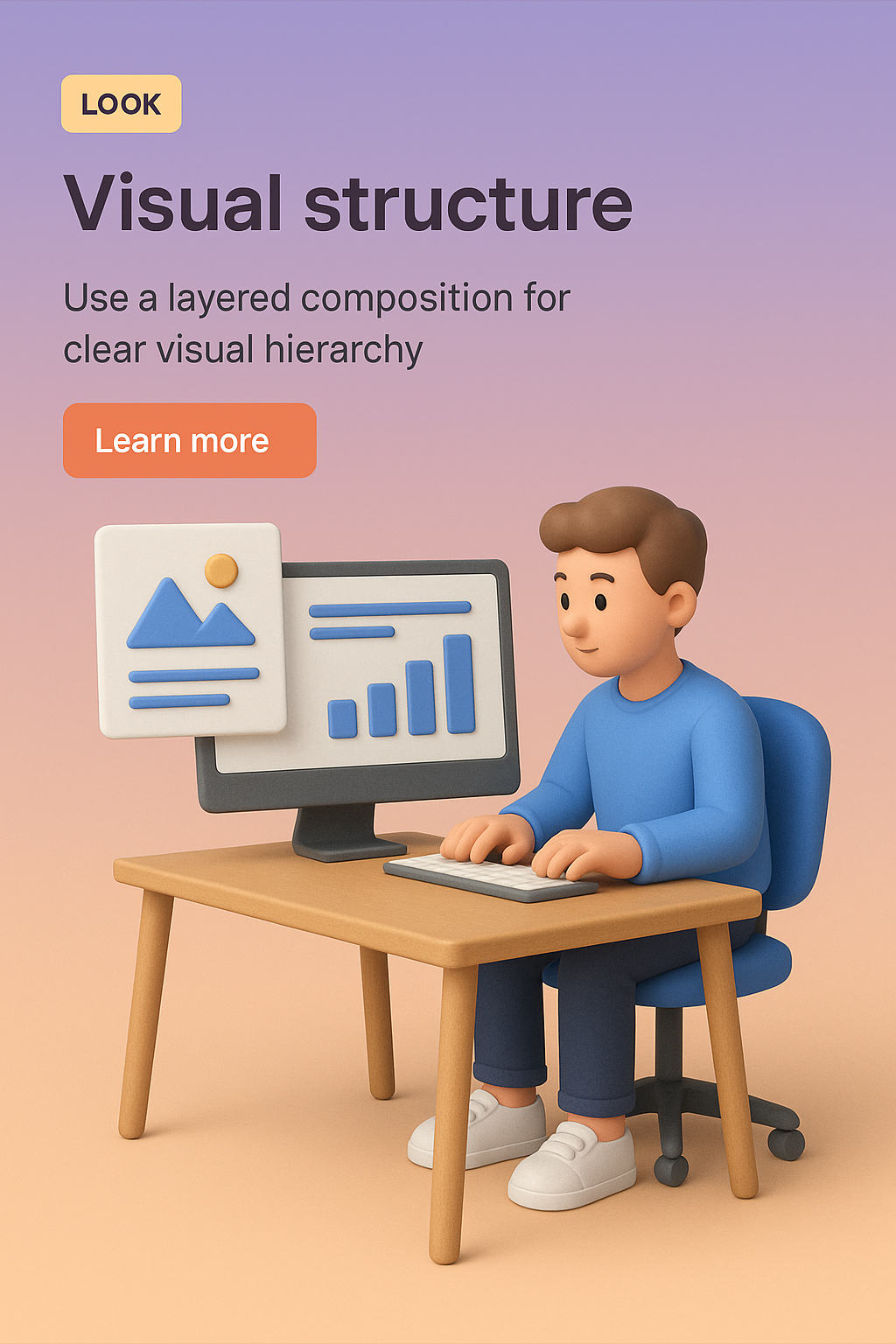 A zoomed-out 3D illustration showcasing a person at a desk with a computer, focusing on visual structure and design elements in a layered composition.