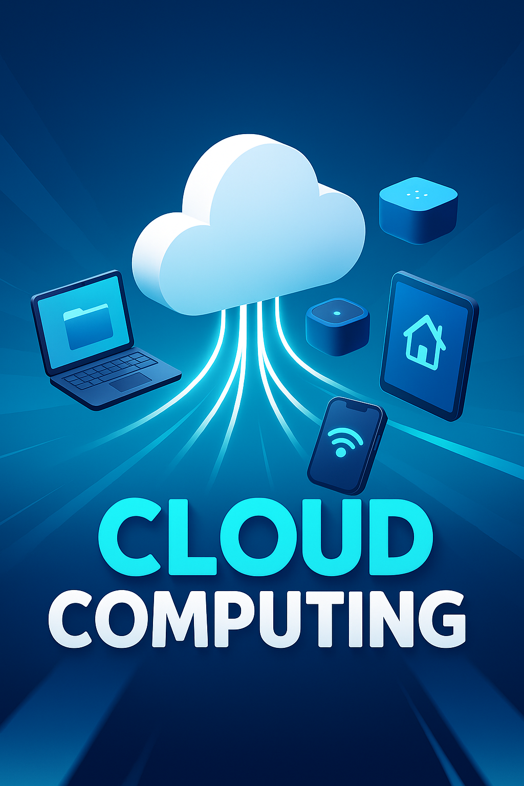 /Collection: /by davooda/Type: PNG/A vibrant illustration showcasing cloud computing. Features a cloud icon, devices like a laptop and smartphone, and dynamic lines radiating from the center, symbolizing connectivity.
