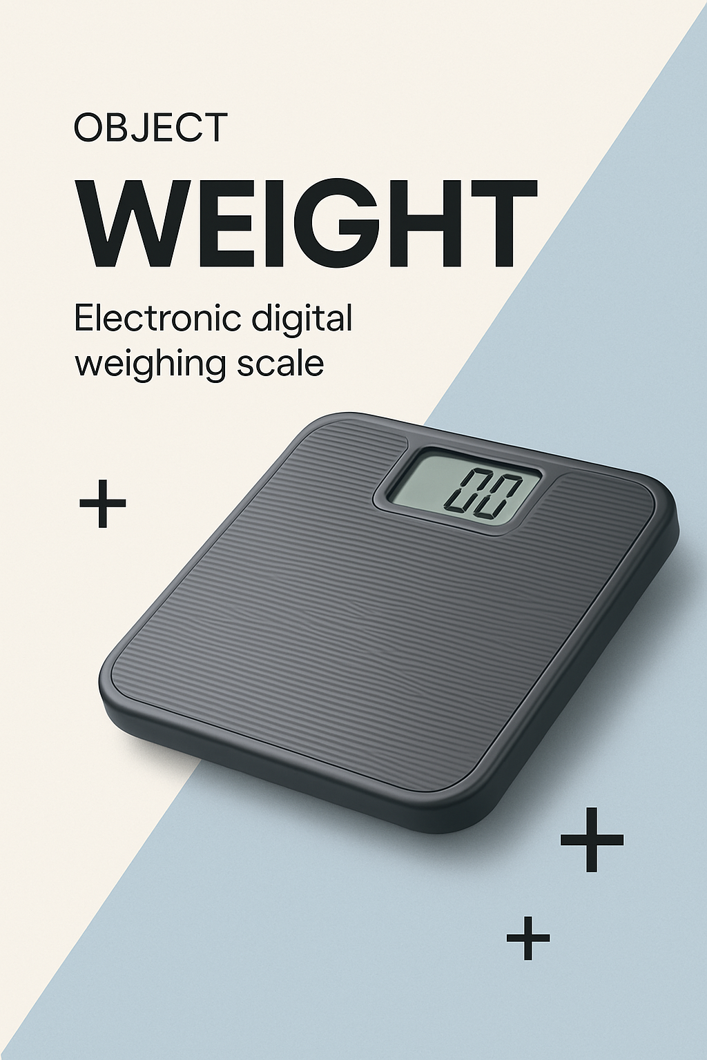 A sleek electronic digital weighing scale is showcased against a blurred office background. The design features a diagonal split in light colors, enhancing the product's visibility.